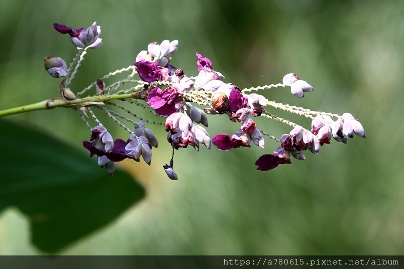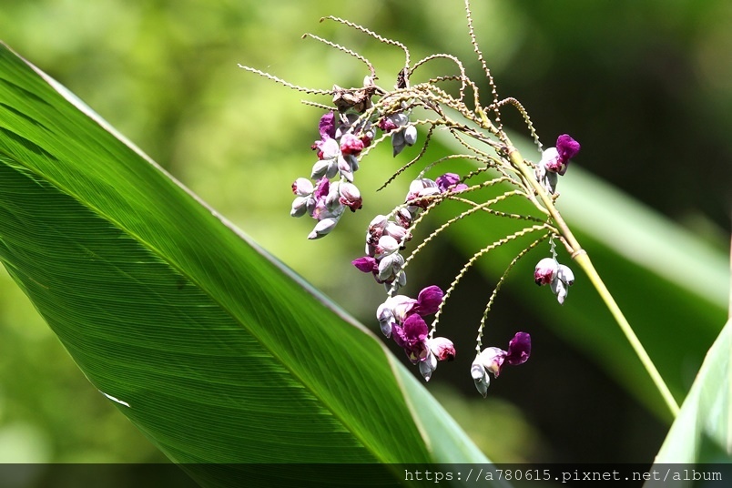 出沒,而水竹芋的葉片與紫紅色的花序就像旗子一樣