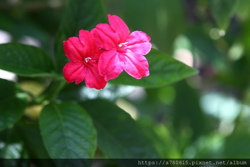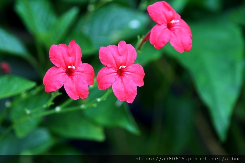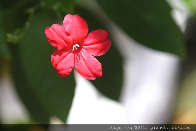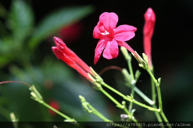 ,花徑4㎝,花冠5裂,花色桃紅至紅色。開花期春至
