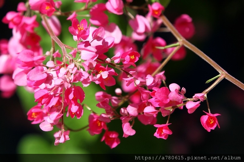 桃紅色的心型花苞,搭配枝梢細長捲鬚,十分嬌美可