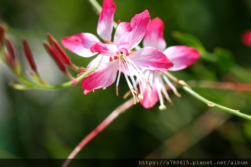 山桃草的莖幹纖細直立,花成密生的穗狀花序,花序較長,一陣風吹來,搖擺得厲害,開在枝頭的花,顯得很婀娜。