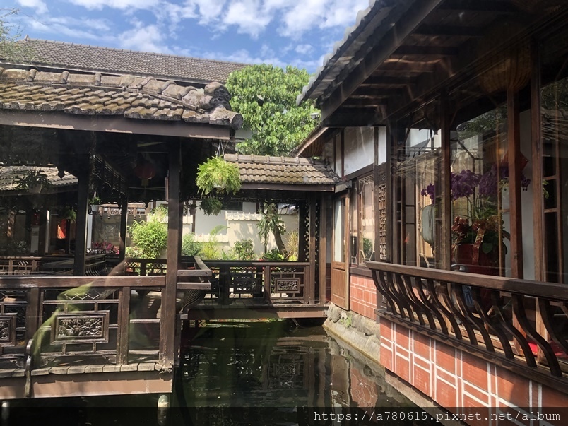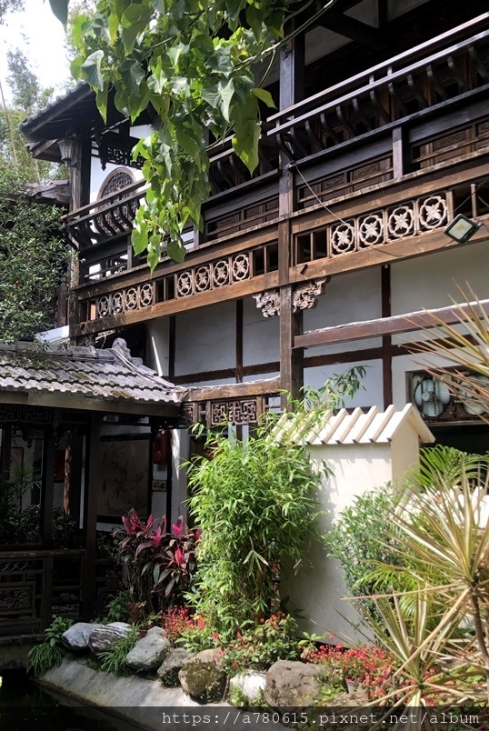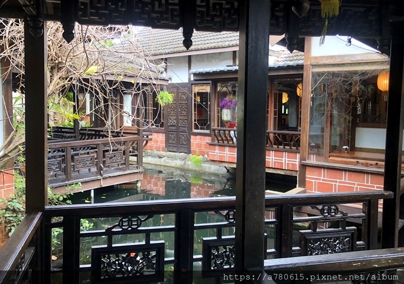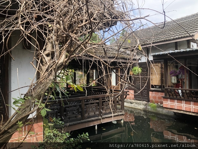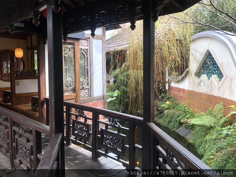 典雅古樸的中式建築、木造迴廊、小橋流水造景,十