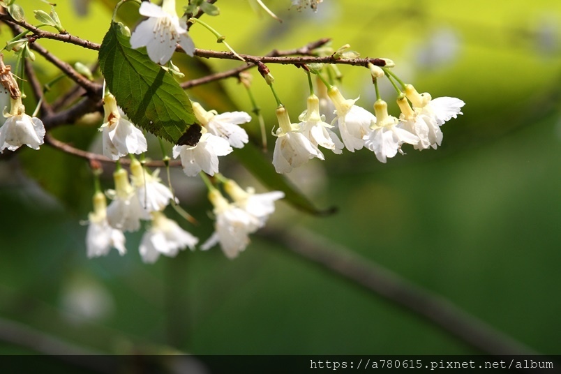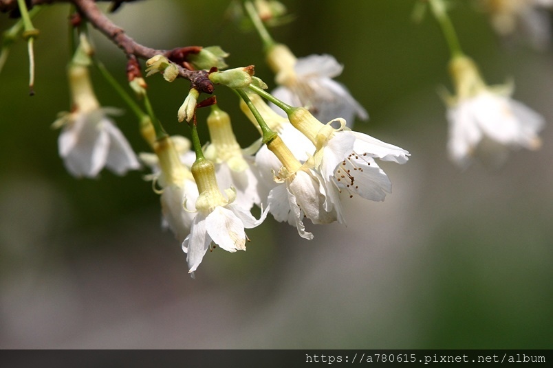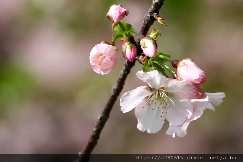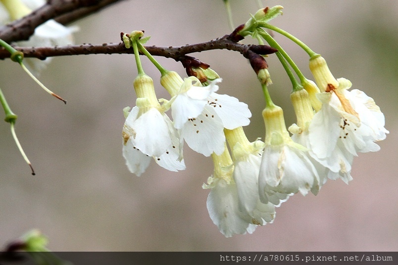 大漁櫻,花先葉開放,花徑約4.0cm;萼筒鐘形,萼片