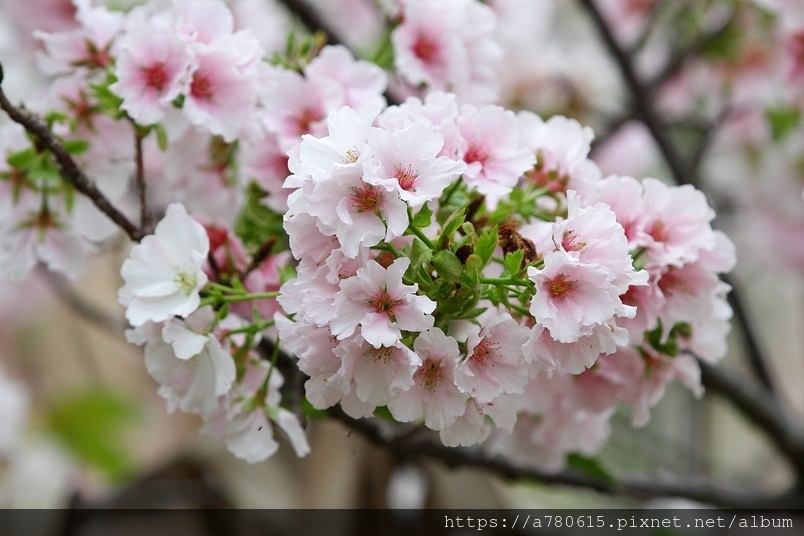 墨染櫻,枝條色深如淡墨,圓潤的花形,初開花時,