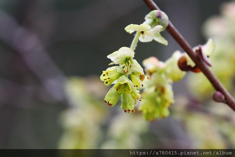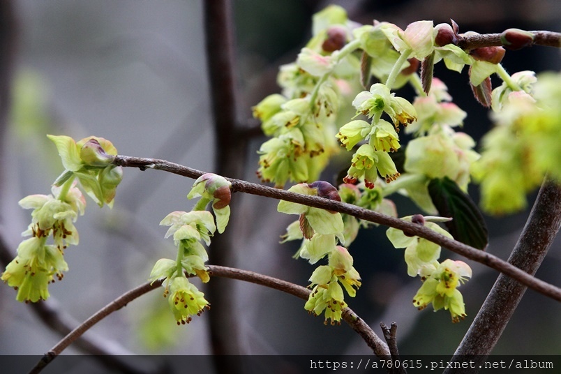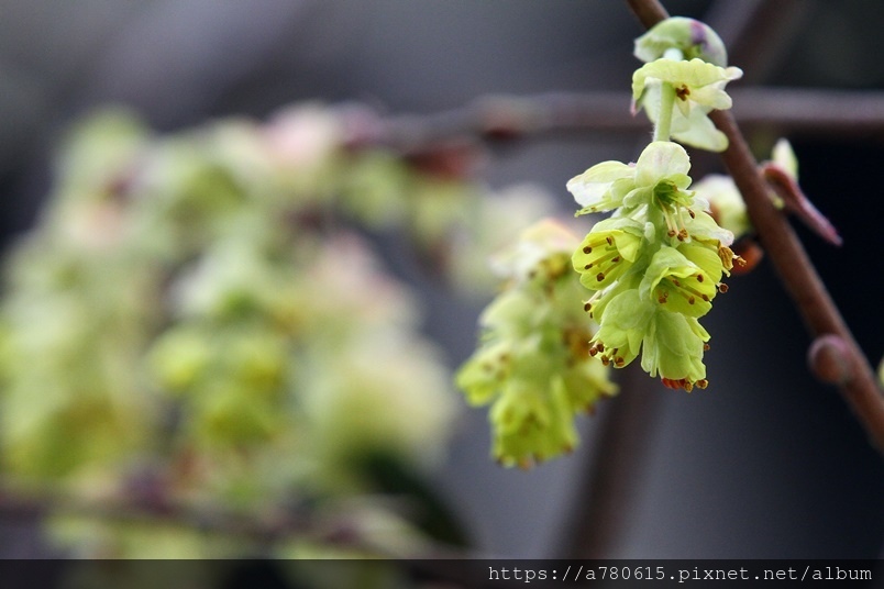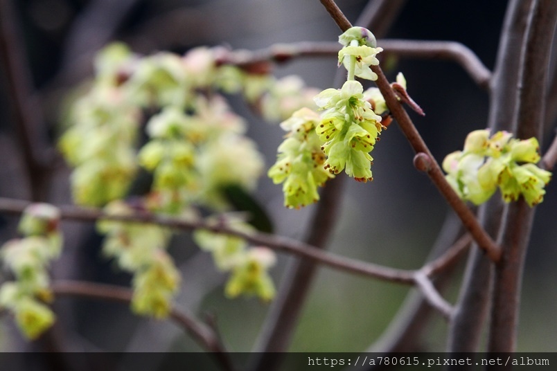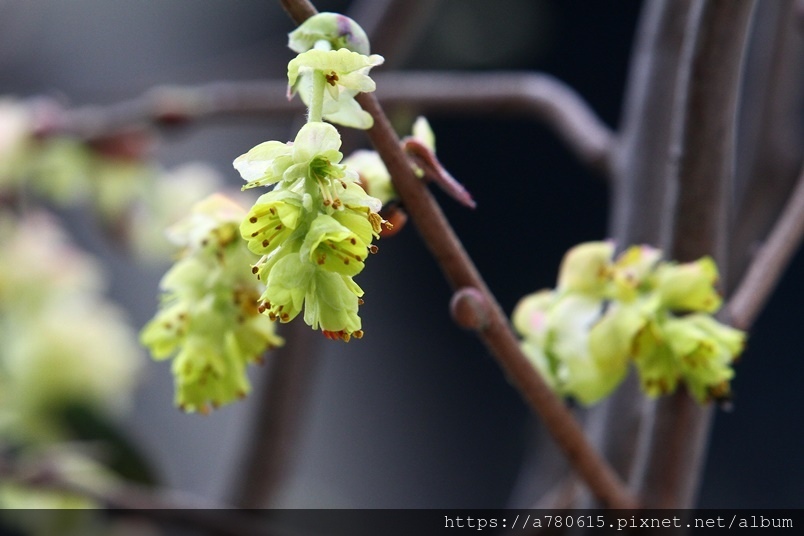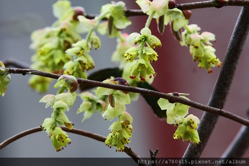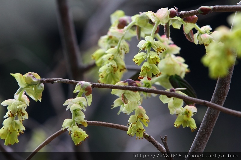 小花排列為下垂的總狀花序,花期3-4月。
