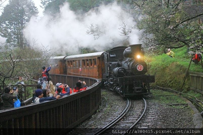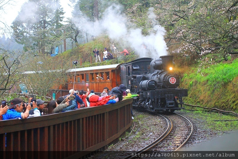 。在花季時,阿里山專屬的蒸汽小火車緩緩經過櫻花
