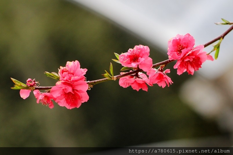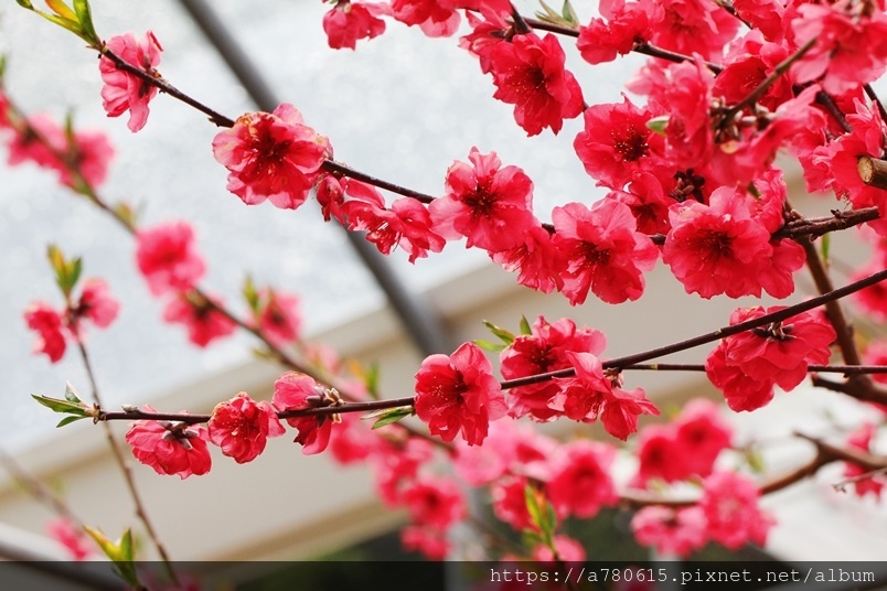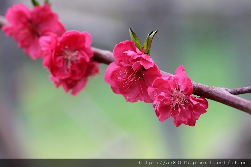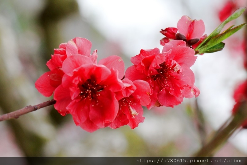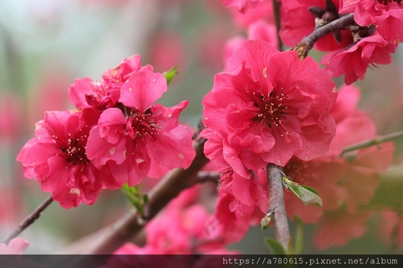 花單生,粉紅色,春天時,花先葉開,滿樹燦爛的花朵,