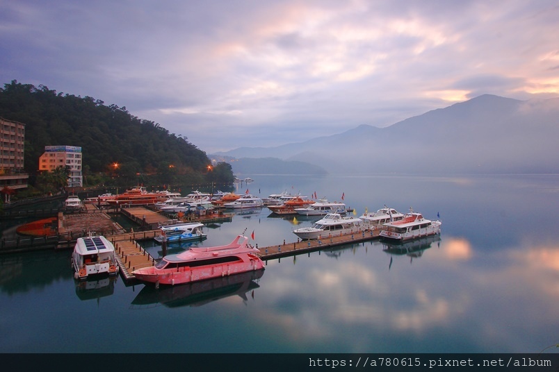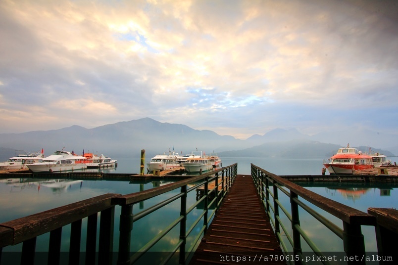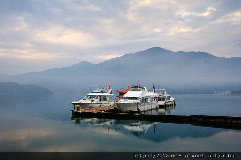 來到清晨的日月潭水社碼頭,薄霧如紗,湖水如鏡,寧