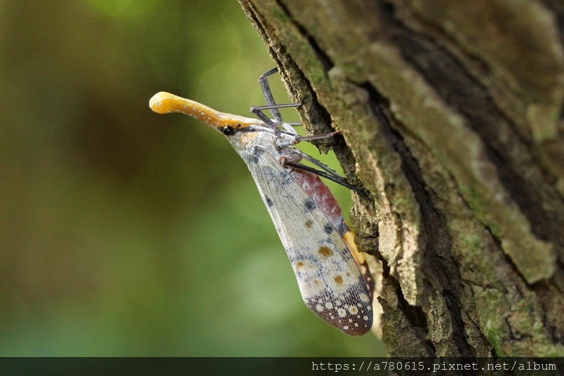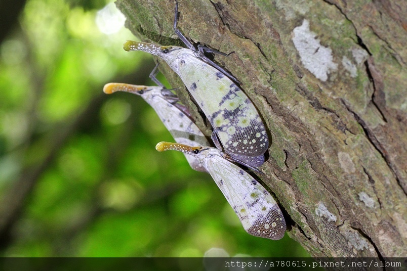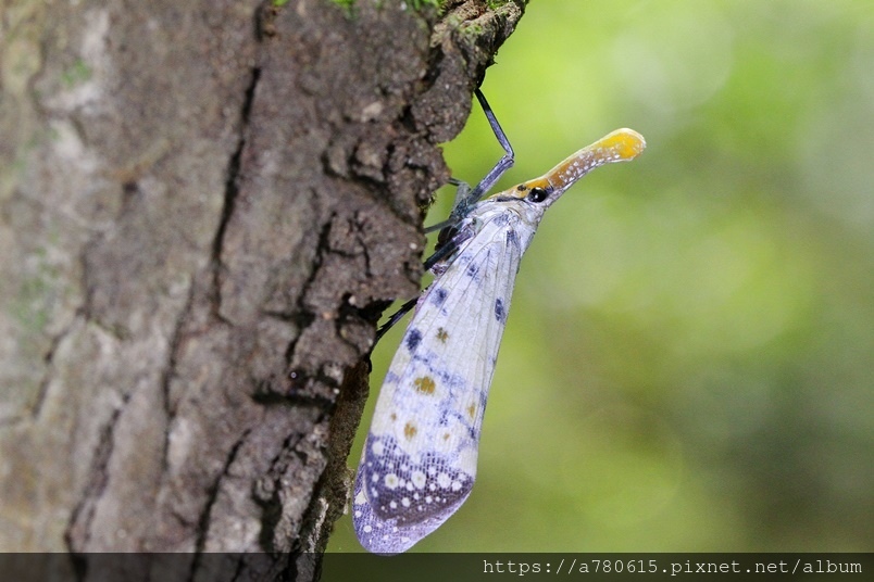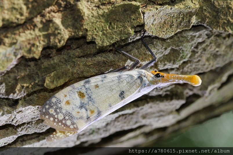 渡邊長吻白蠟蟬,體長34-42mm;頭前額向前延伸一棒
