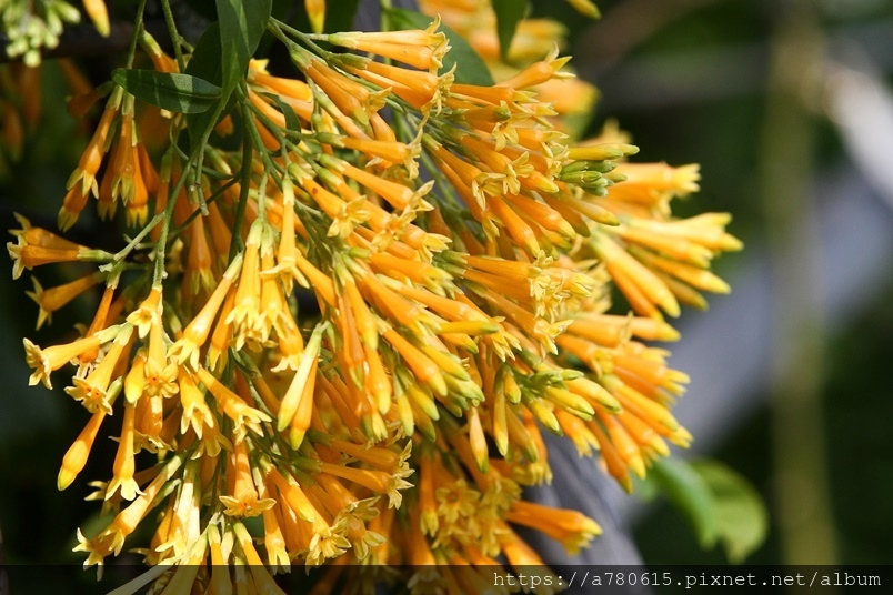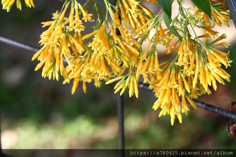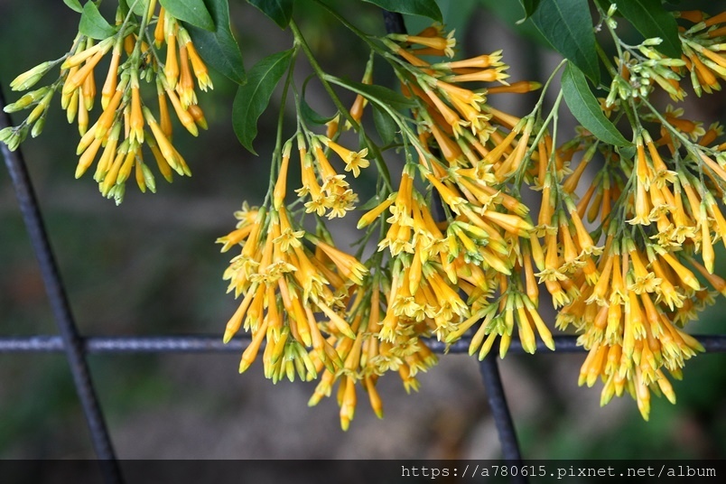 總狀或圓錐花序自枝端或近枝端的葉腋伸出,花朵高腳碟形,長3~4㎝,星形花冠5裂。花初開黃色,近凋謝時呈橘黃色。