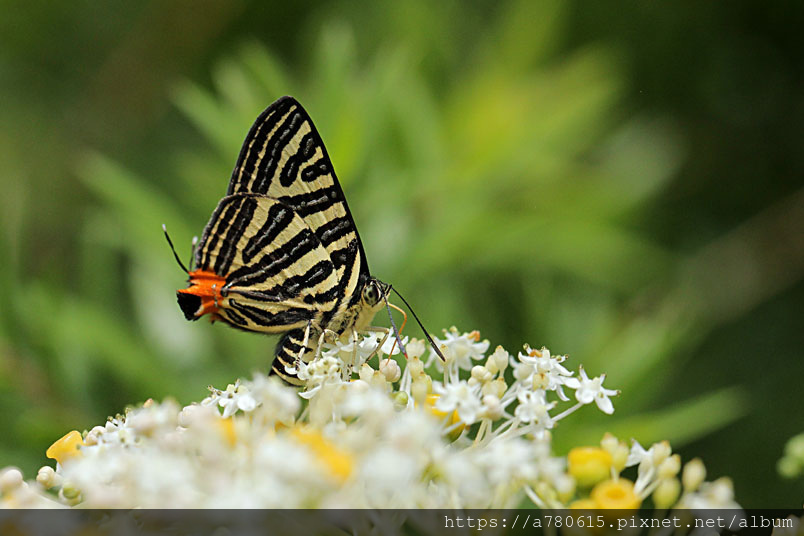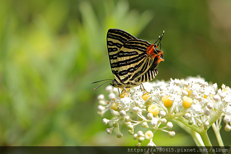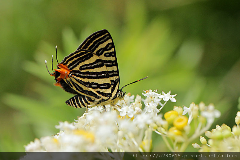 色具不明顯的藍紫色光澤,翅腹面有黃黑條紋猶如虎皮,