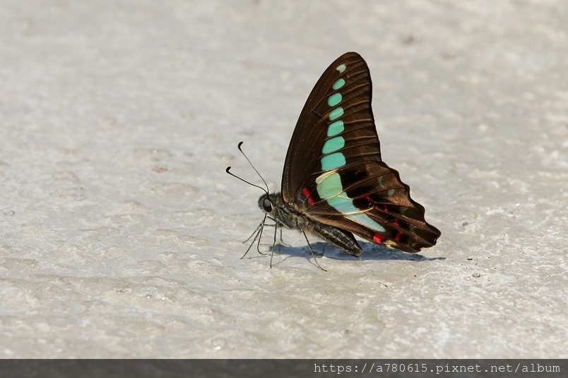 顯,翅腹面也有青帶斑紋但後翅近肛角區域具紅斑。