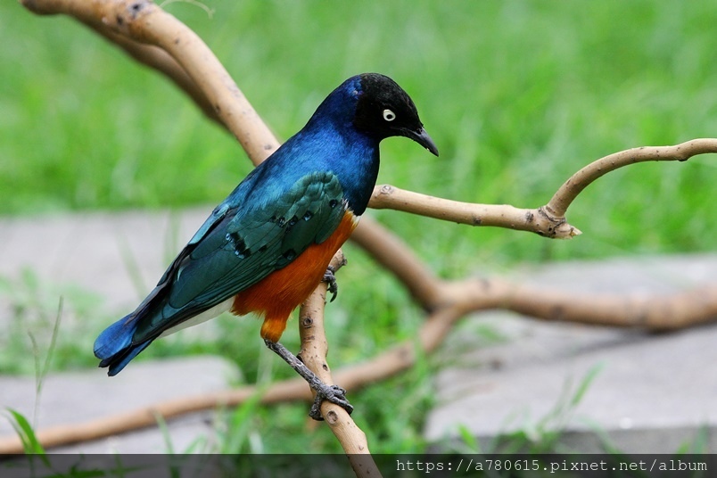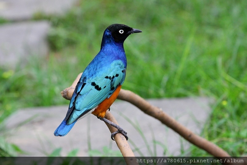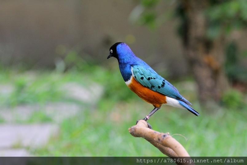 椋鳥科,長約18cm,頭黑色,胸、背及翅膀為藍色及藍綠色的混合,閃耀著金屬光澤,腹部栗色,胸腹之間以一條白色橫斑為界,尾下覆羽白色,嘴與腳黑色。外表相當豔麗,是八哥的親戚,目前歸類為逸鳥。