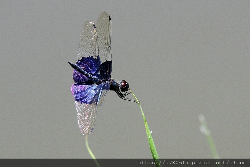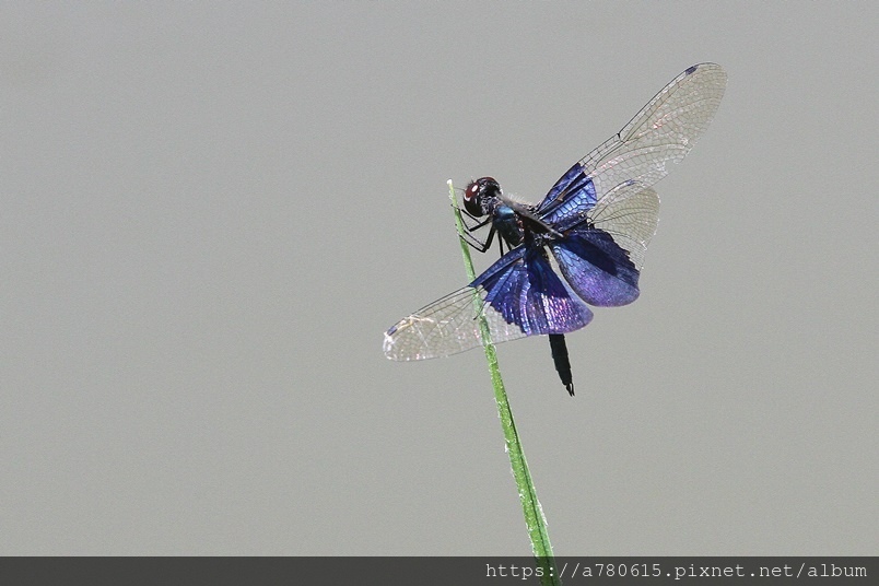 三角蜻蜓,兩對翅膀披覆著強烈金屬光澤的藍紫色,是