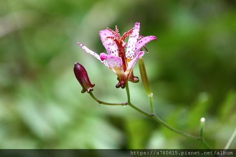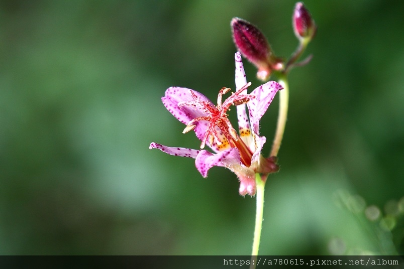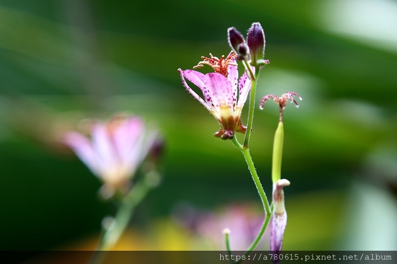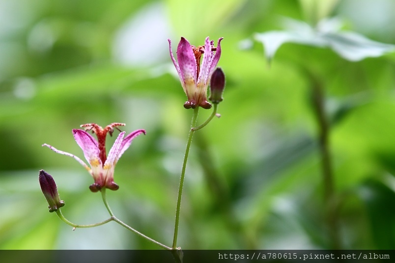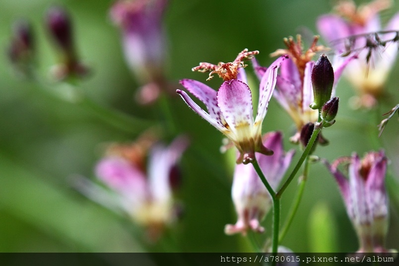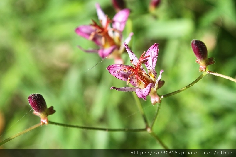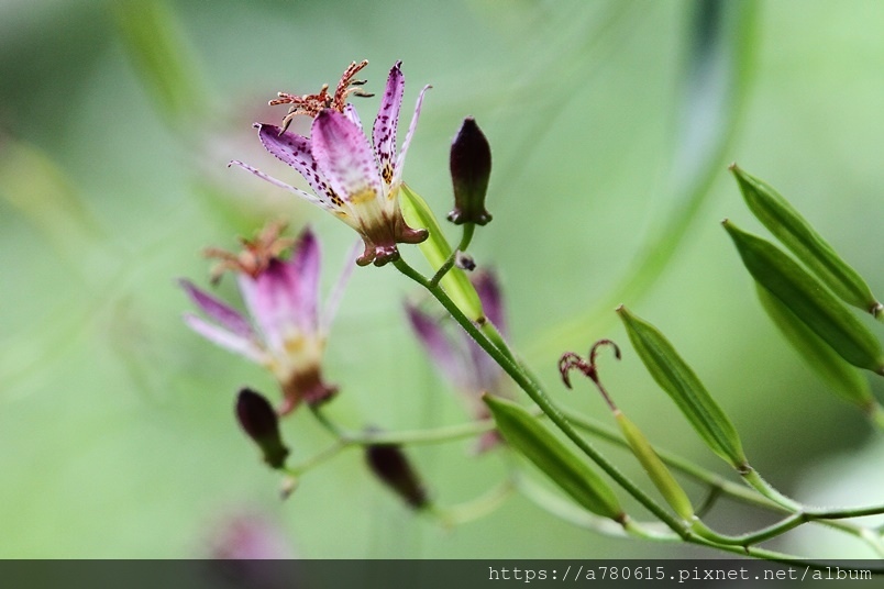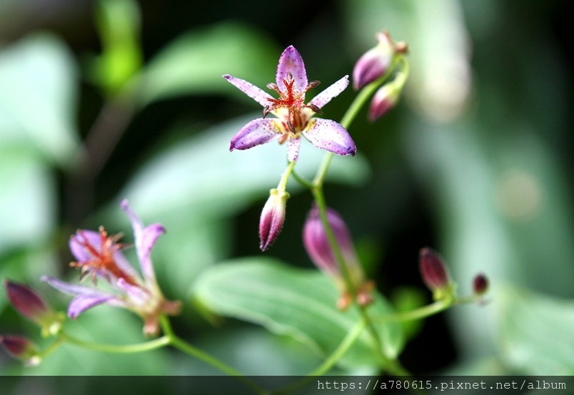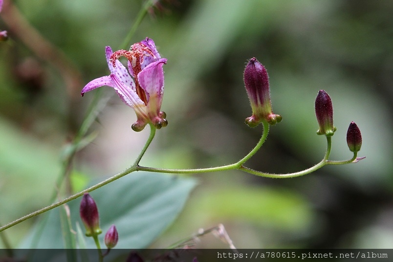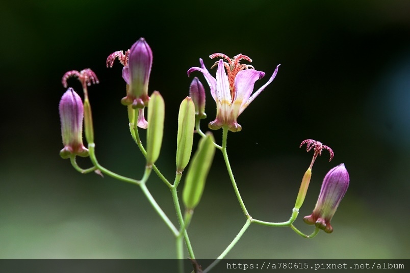 花數朵之疏生繖房花序,花呈喇叭狀,花被白紫色,花