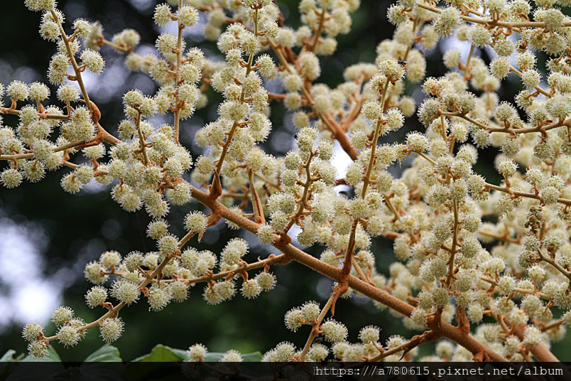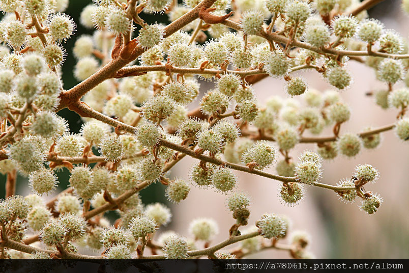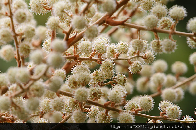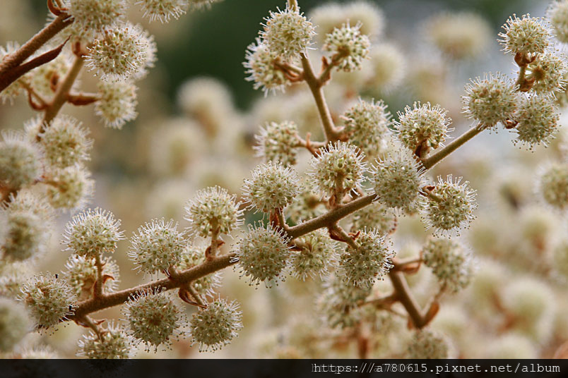 花小,淡黃白色,密集成球狀繖形花序,再由多數繖形