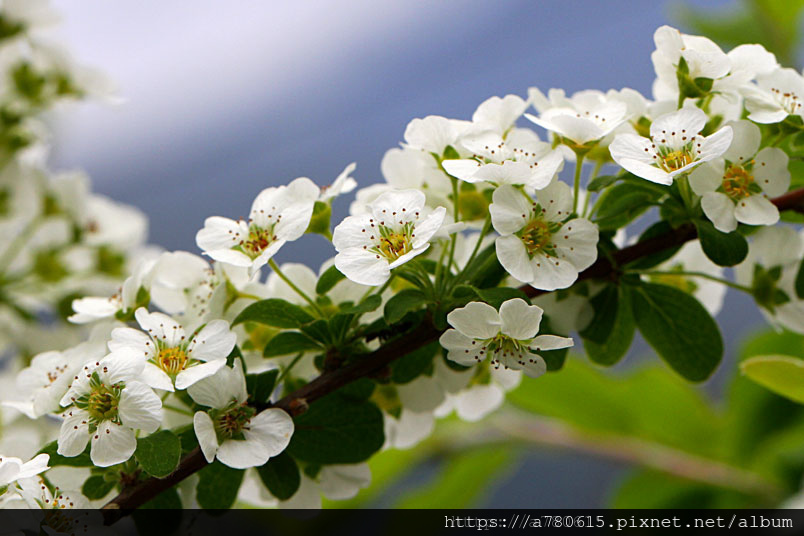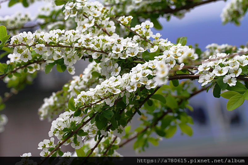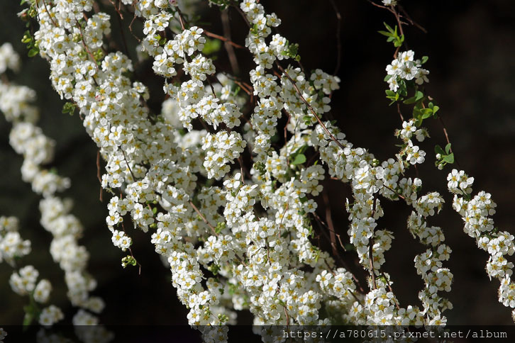 每年春季,笑靨花於枝上密綴雪白小花,迎風搖曳,