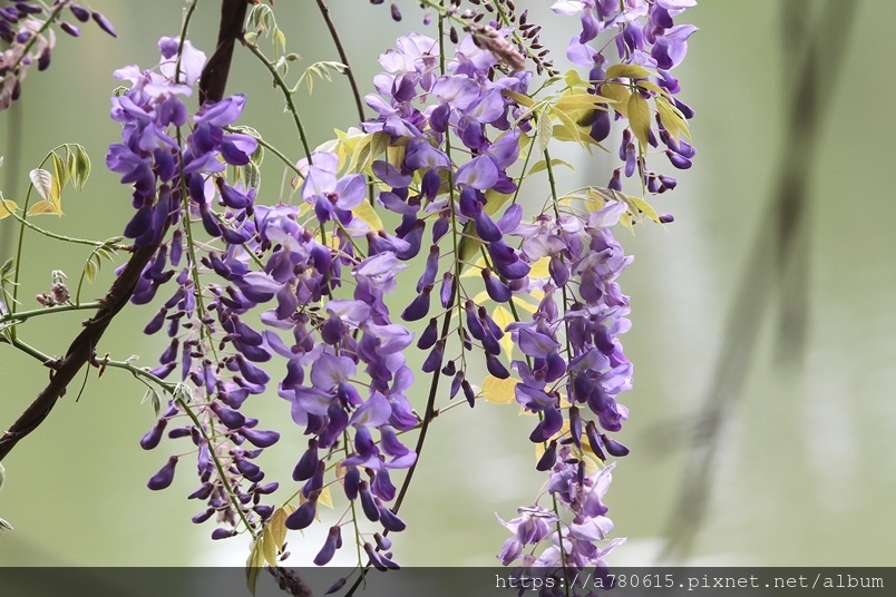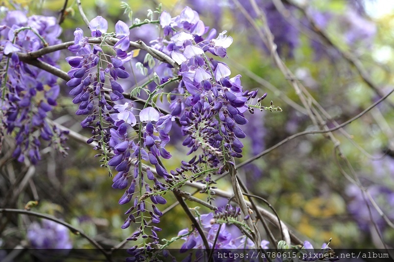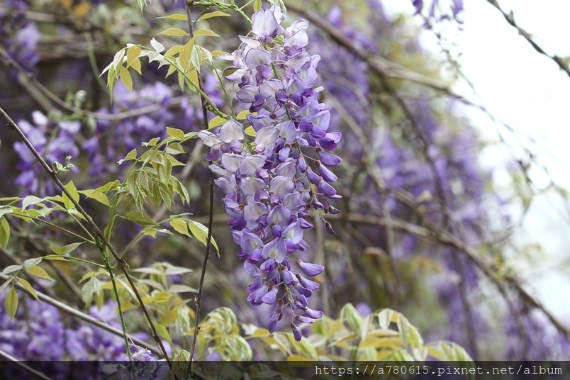 雨瀑流洩而下的紫藤花穗,聞著淡淡的花香,沉醉在充