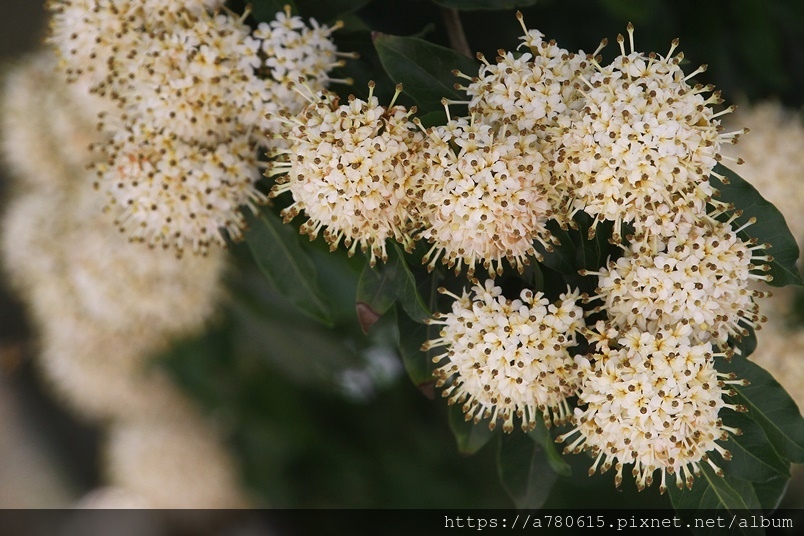 花頂生白色,繖房花序或圓錐花序自枝端開出,形如