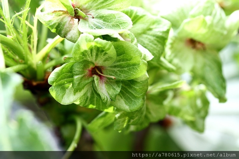 花瓣帶著淺淺的綠,花芯有著點朱紅,還有可愛的蕾絲