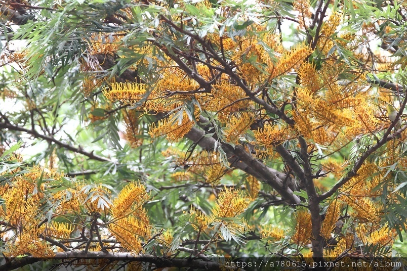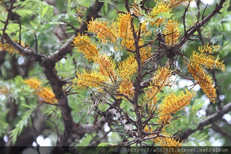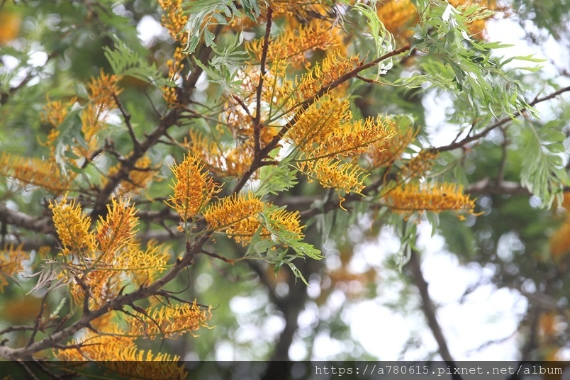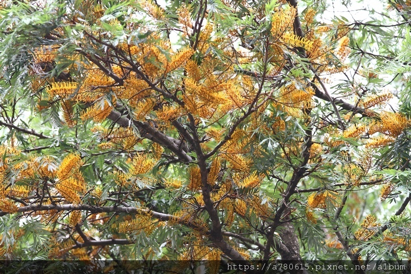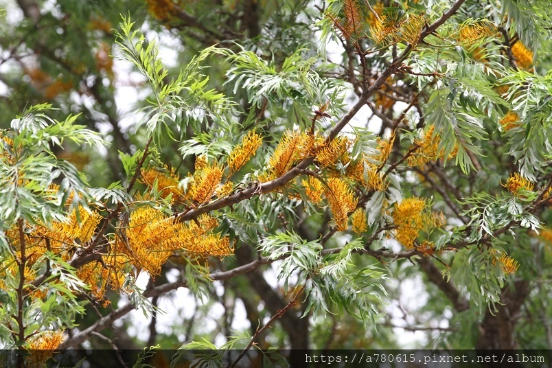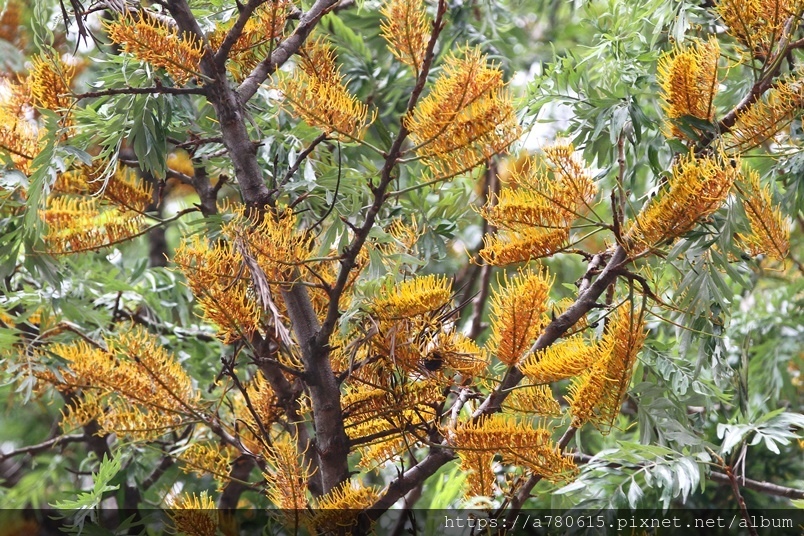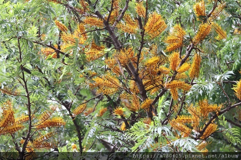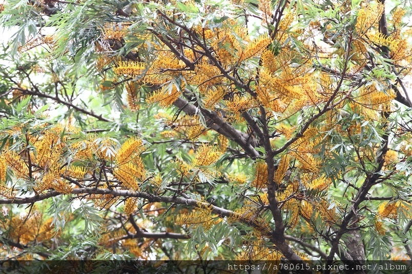 每年四、五月會在枝條端開出金黃色花序,花為雌雄同