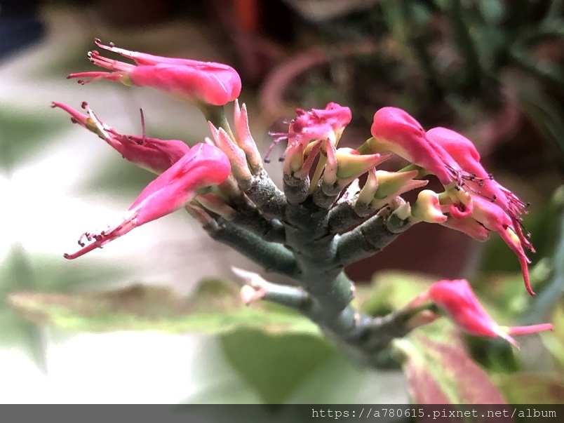 狀花序排列;花序形似紅色鳥嘴,花期12至翌年6月。
