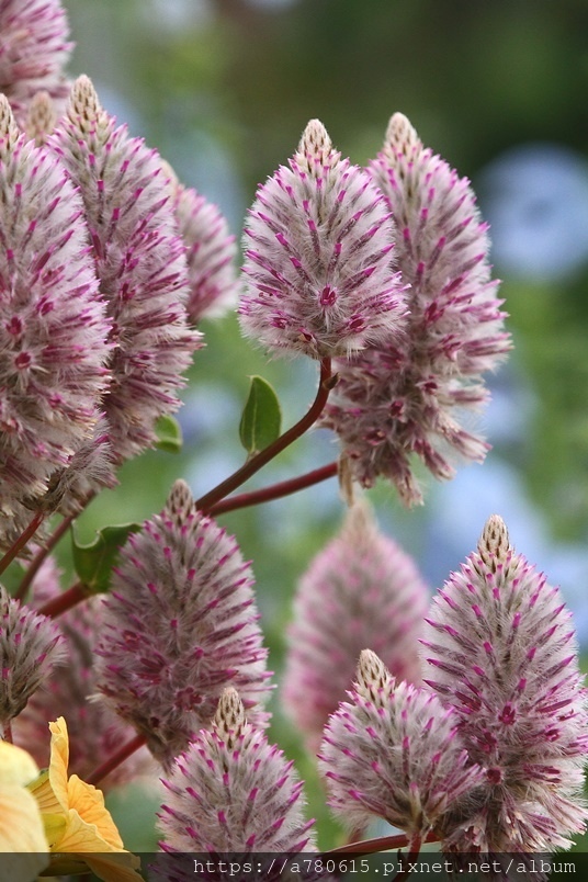 圓錐型穗狀花序自莖端及葉腋伸出,苞片褐色,長筒狀花萼密生白色絨毛,頂端為桃紅色。