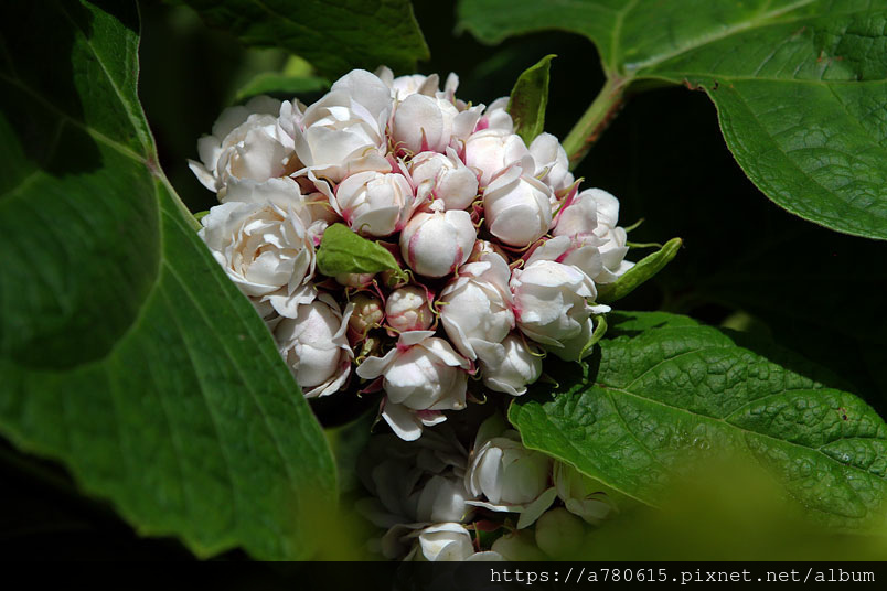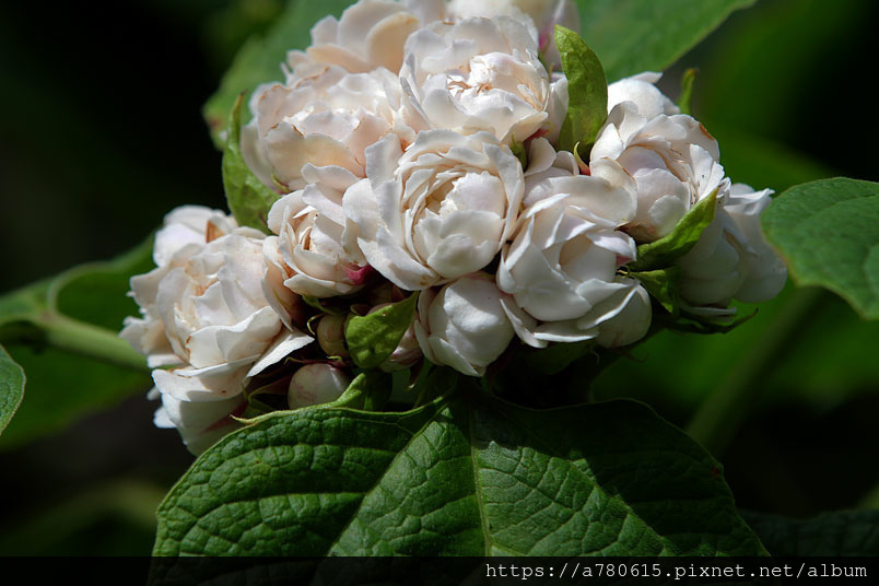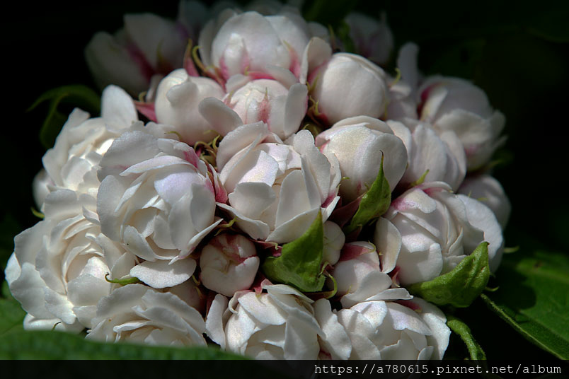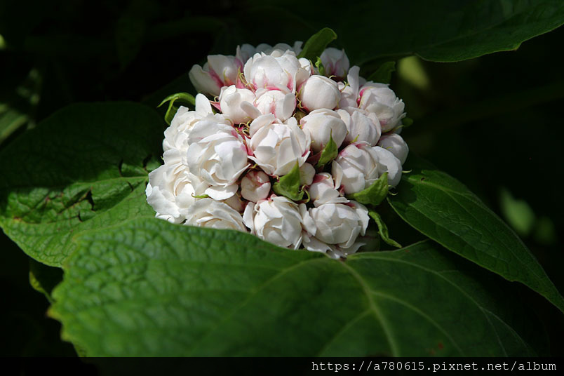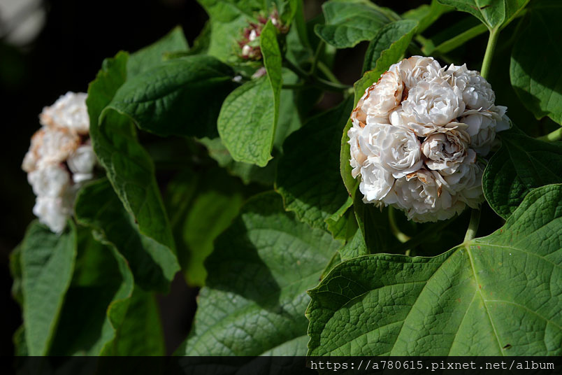 枝端伸出密生聚繖花序。每花序有數十朵白或粉紅
