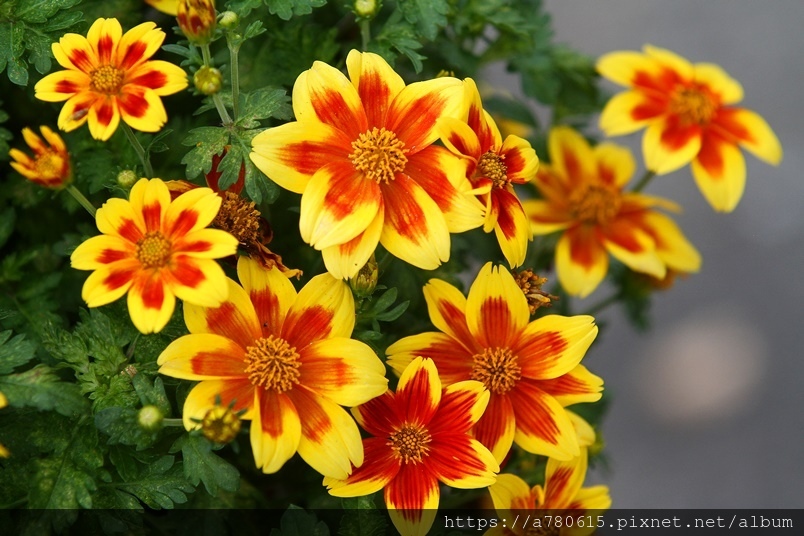 頭狀花序頂生,舌狀花粉、黃、橘色,有漸層複色品種。